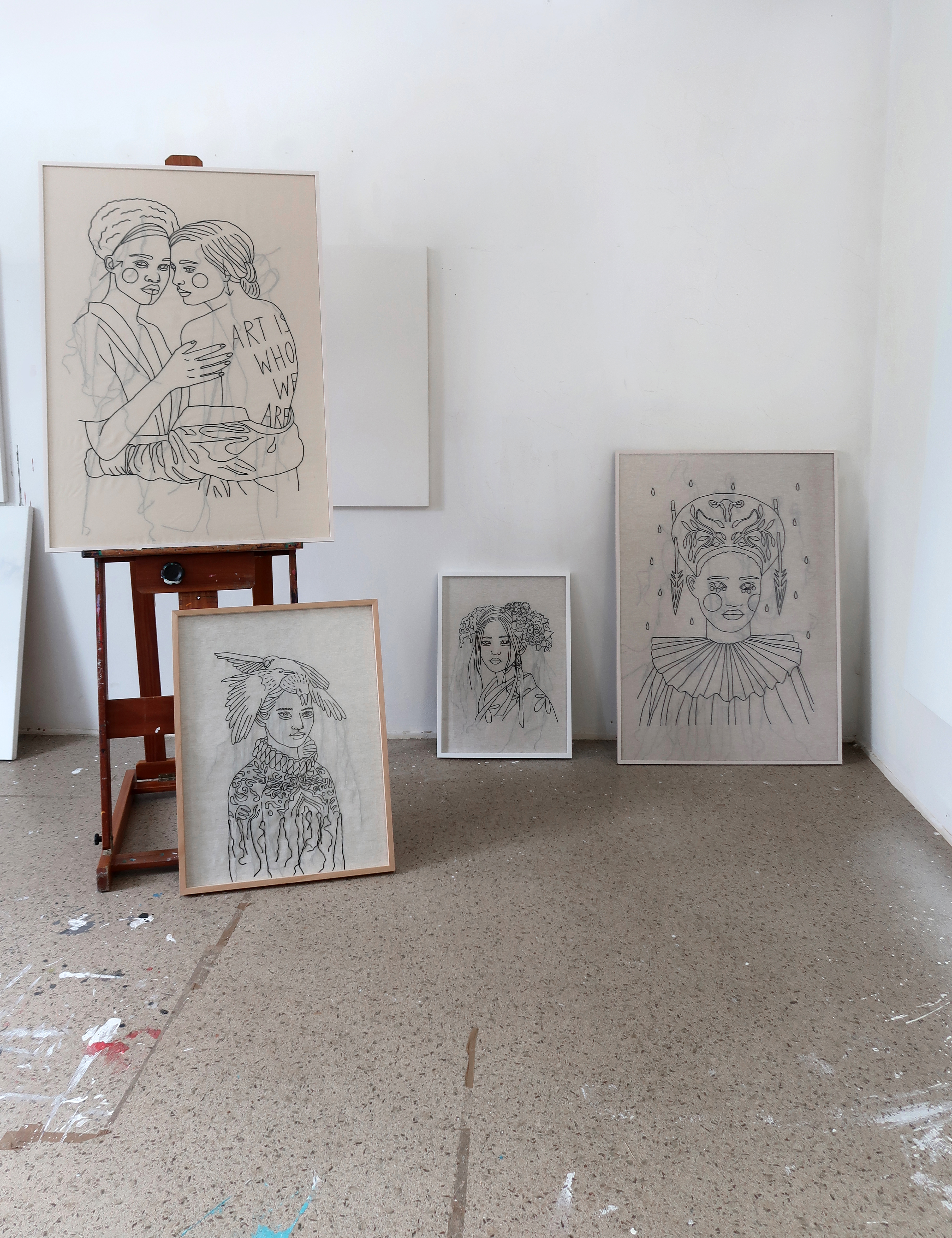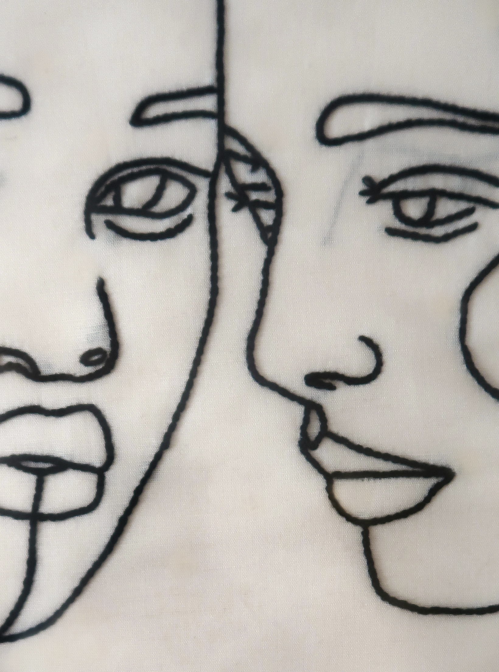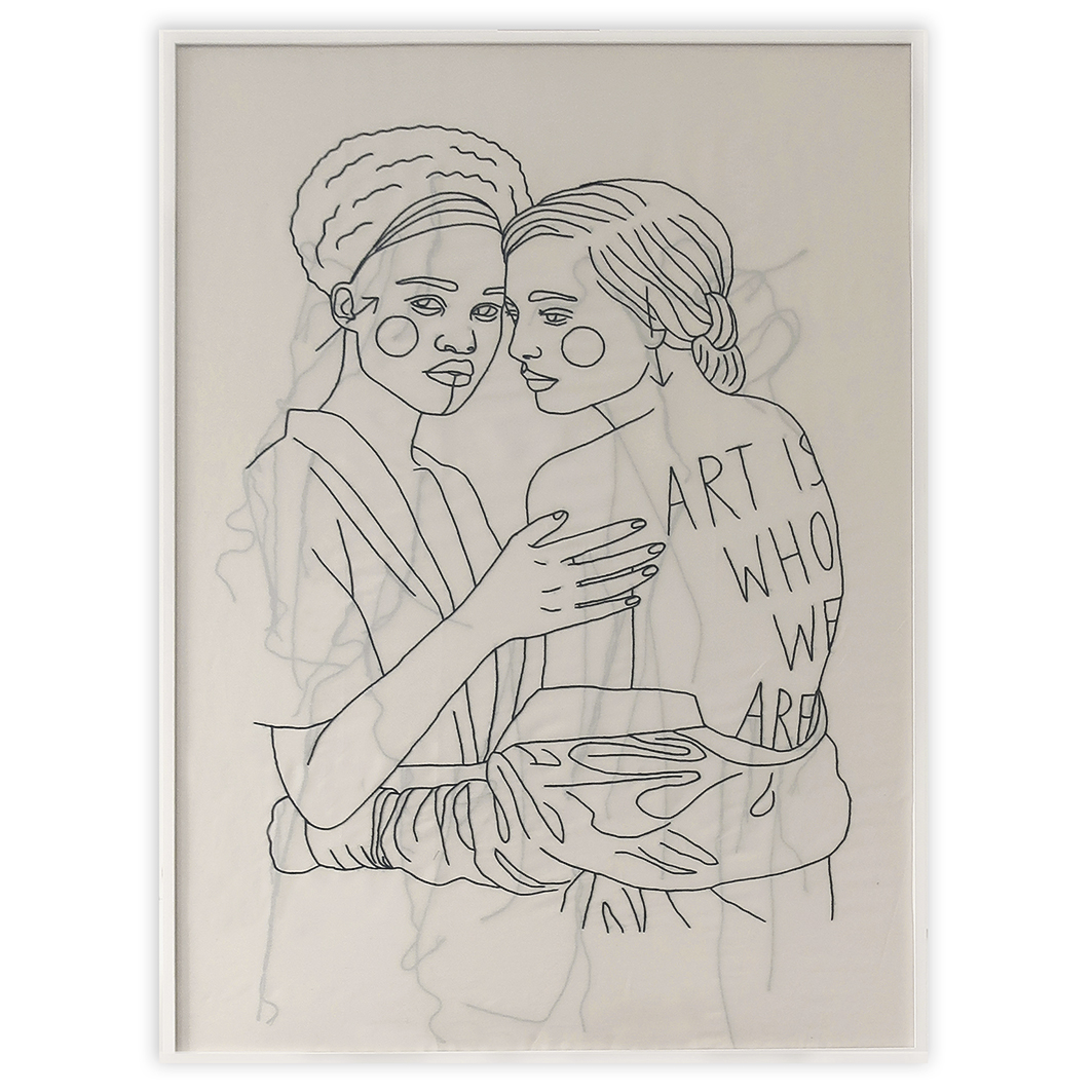 Every embroidery drawing is hand finished by myself, I arrange a second layer of yarn on the front or back side before I frame the artworks.