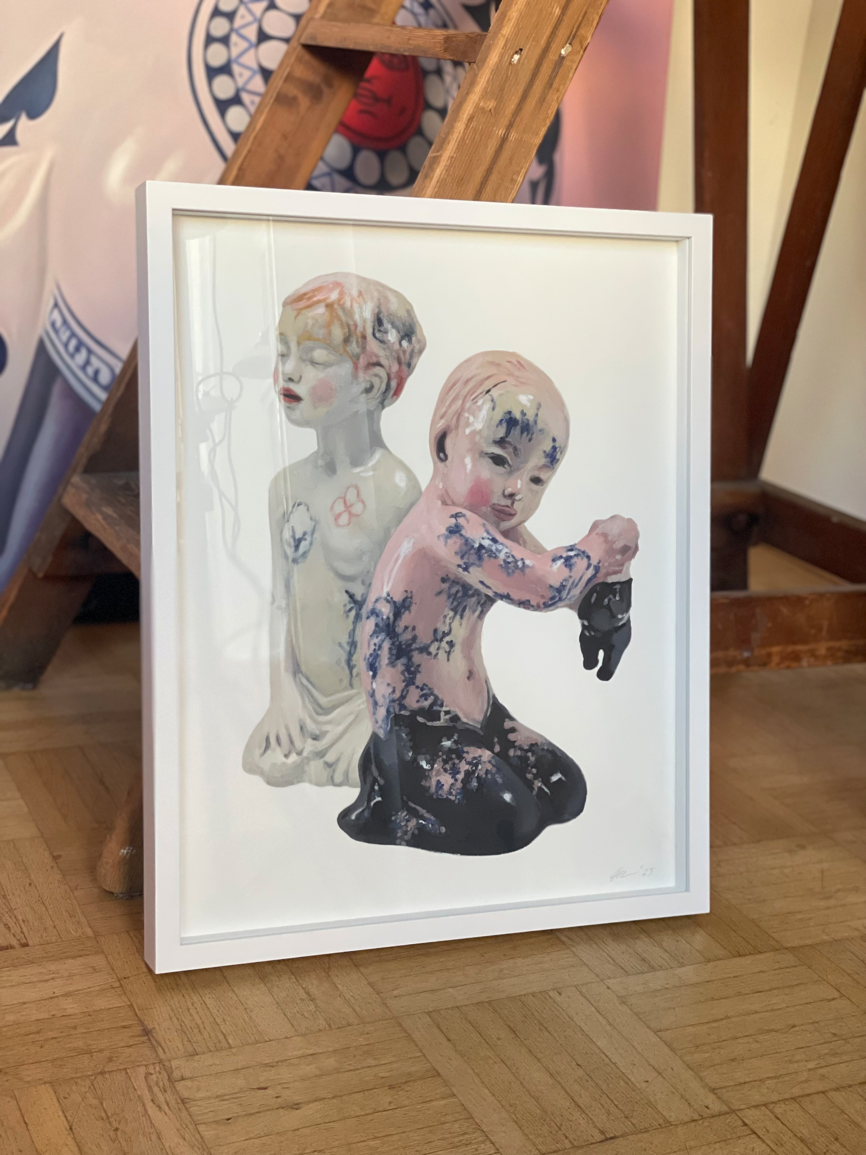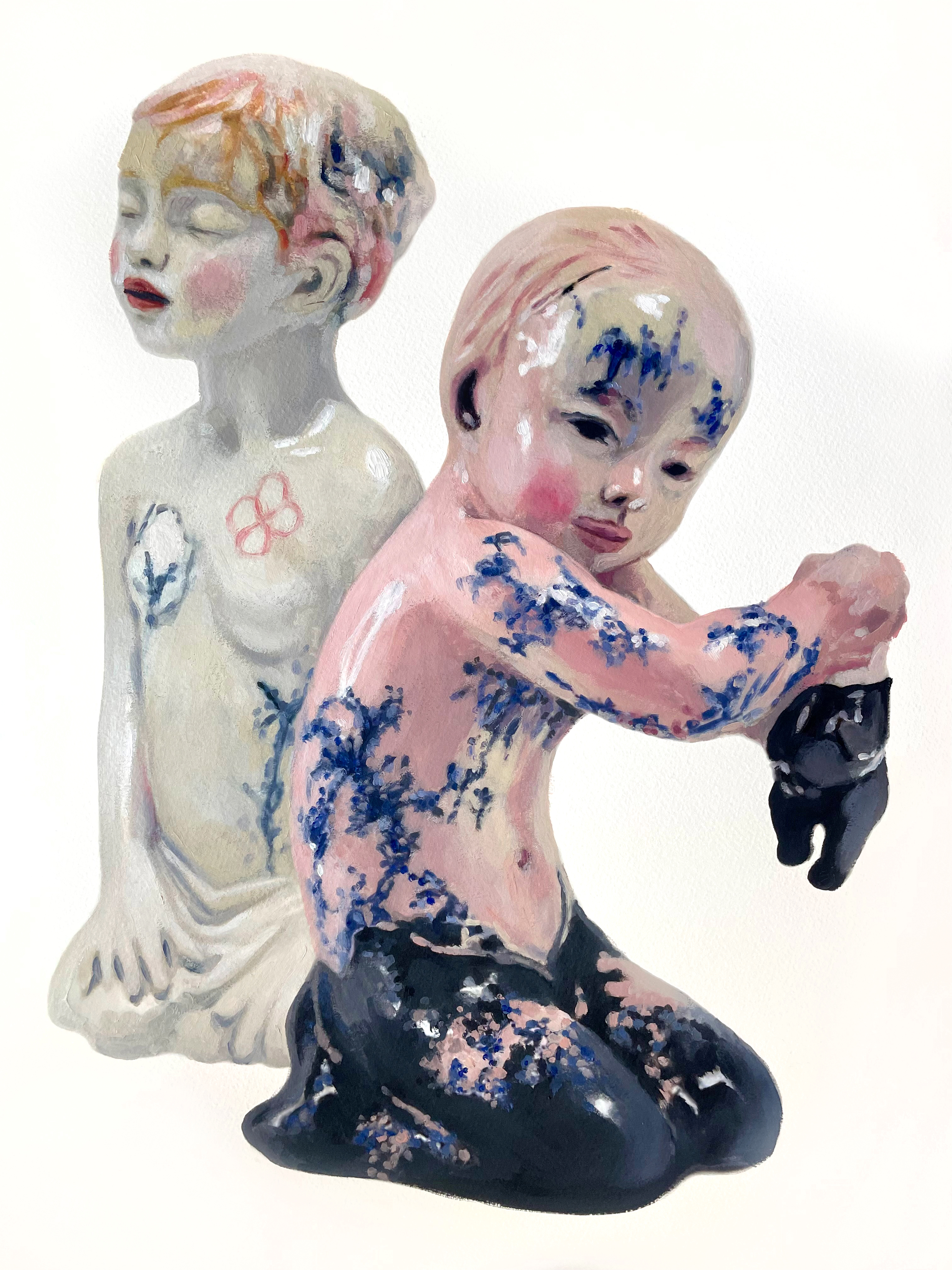 Accompanying the AI film Coming from Pinklandia, Tanja Hirschfeld presented a series of small oil paintings that reference the porcelain figures appearing in the film. The figures seem childlike yet artificial — fragile hybrid beings somewhere between human, toy, and symbol. Their glossy surfaces and delicate colors stand in contrast to the weight of their subject matter.