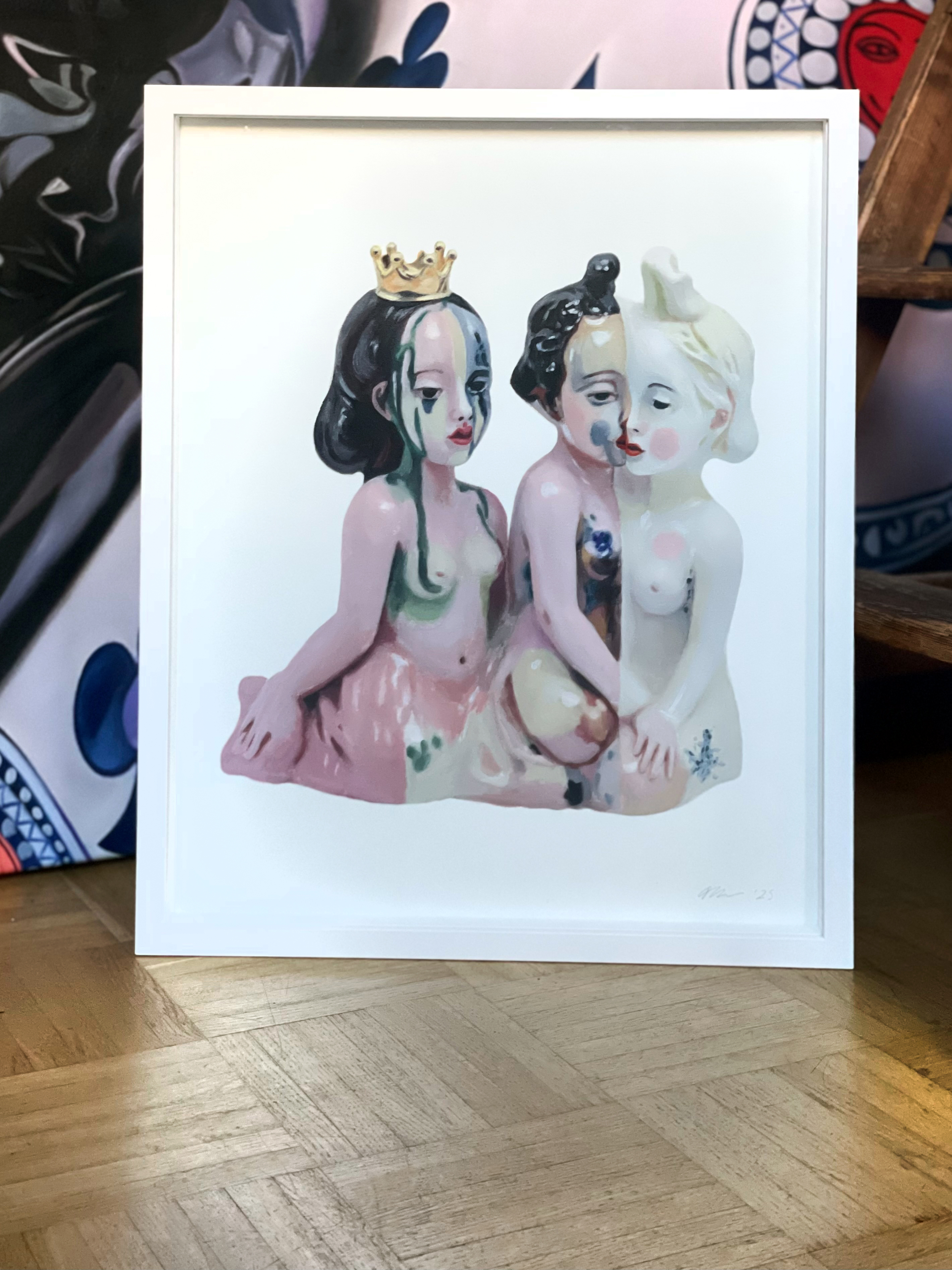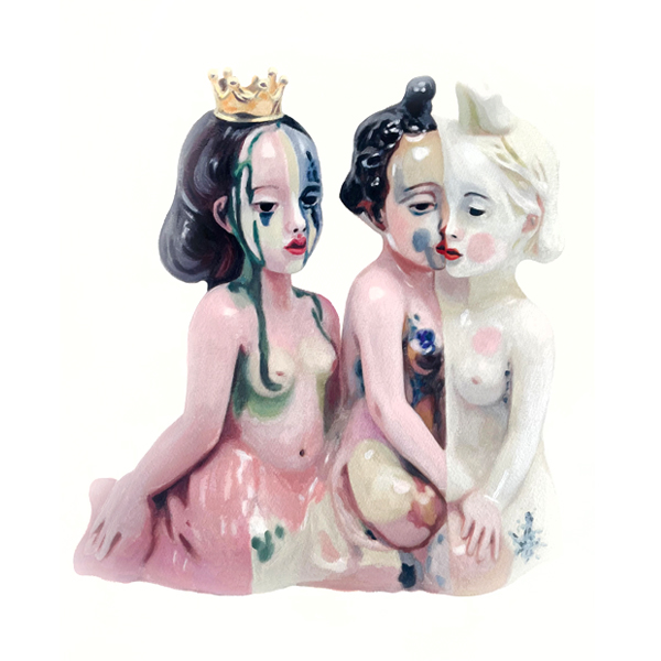 Accompanying the AI film Coming from Pinklandia, Tanja Hirschfeld presented a series of small oil paintings that reference the porcelain figures appearing in the film. The figures seem childlike yet artificial — fragile hybrid beings somewhere between human, toy, and symbol. Their glossy surfaces and delicate colors stand in contrast to the weight of their subject matter.